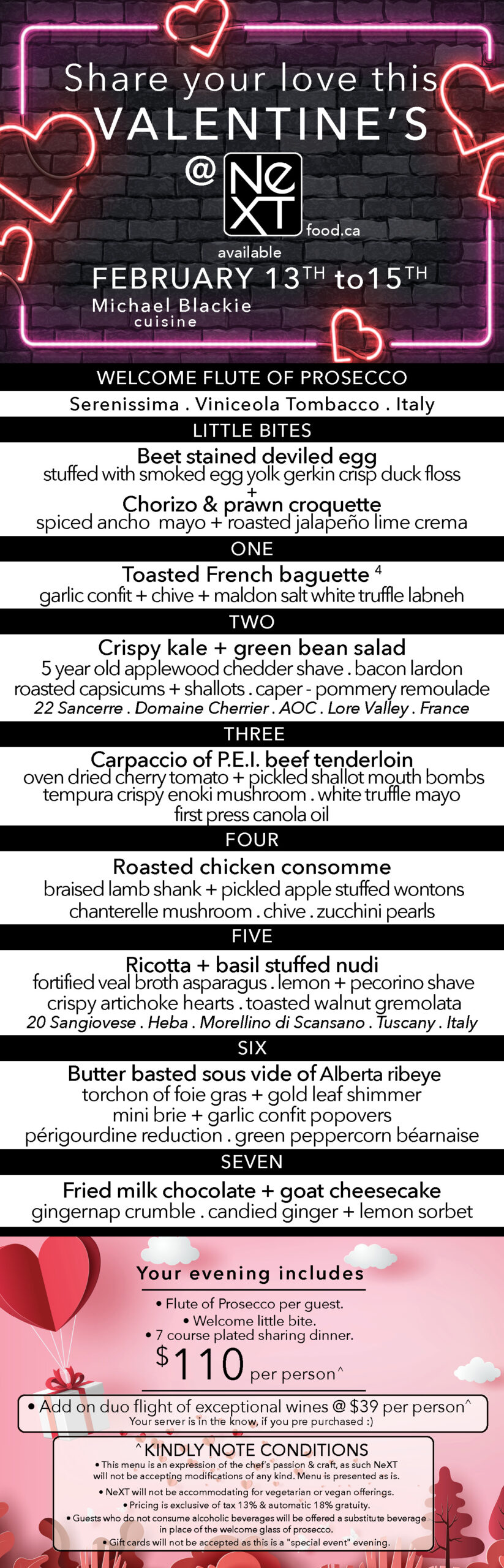 – This menu is an expression of the chef’s passion & craft, as such NeXT will not be accepting modifications of any kind. Menu is presented as is.
